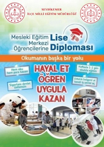 Hem öğrencilere hem de işverene çeşitli imkanlar sağlayan program hakkında vatandaşları bilgilendiren Seydikemer İlçe Milli Eğitim Müdürlüğü şu bilgileri paylaştı: “Mesleki ve akademik hedeflerine ulaşırken bir şekilde örgün eğitim dışı kalmış veya sonradan meslek edinip yeterliliklerini belgeleyememiş kişiler için açılan Meslek Eğitim Merkezlerinde ustalık, kalfalık ve çıraklık eğitimleri verilerek istihdam ve iş hayatına yönelik çözümlerin üretilmesi amaçlanıyor. Açılan Mesleki Eğitim Merkezi Programında haftada 1 gün okulda teorik eğitim, 4 gün ise işletmede beceri eğitimi verilerek Mesleki Lisesi Diploması ile birlikte çıraklık, kalfalık, ustalık belgesi ve işyeri açma belgesi ile vatandaşlara iş kurma imkânı sunuluyor.